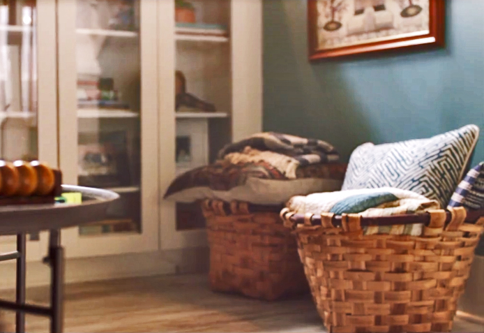 У будинку головного героя ми бачимо плетені кошики з пледами та подушками. Вельми зручне місце для зберігання додаткового комфорту. З кошика в кутку кімнати можна легко дістати плед або ще одну подушку. А також дуже цікавий круглий журнальний стіл плетений з водного гіацинту. Стіл без гострих кутів - відмінний вибір, якщо в будинку є діти-непосидьки.