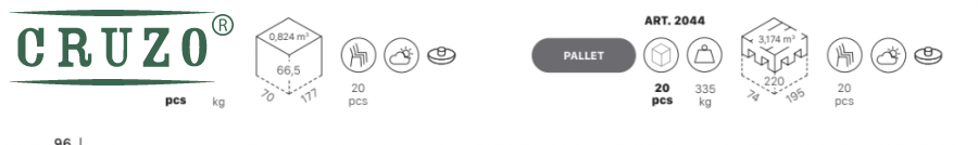 На палеті (ART. 2044): 20 шт., вага 335 кг, об’єм 3,174 м³ (220×74×195 см)