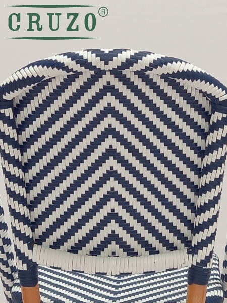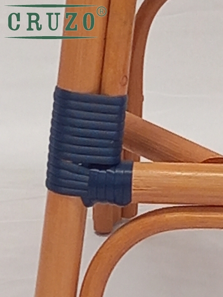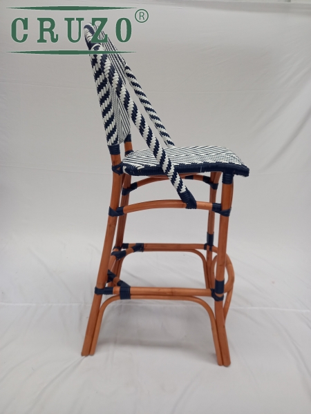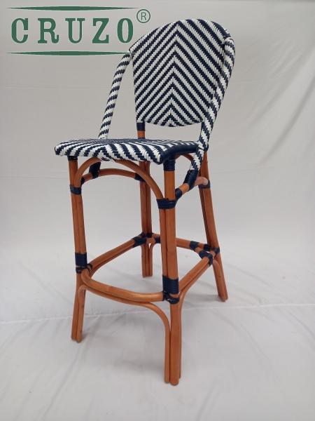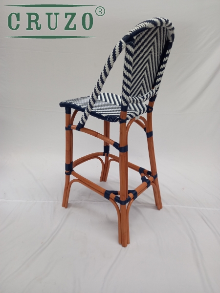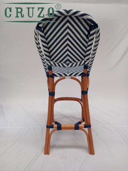 Каркас стула зроблений з натурального ротангу пофарбований в темно-медовий колір.Сидіння та спинка барного стулу в ручну оплетене з штучного ротанга в 2 -х кольорах (білого та синього) .Плетіння має паттерн "шеврону". З'єднання виконані синтетичним ротангом .Вагу витримує не менше за 130 кг.Зроблено надійно для задоволення під наглядом спеціалістів для ТМ СRUZO.