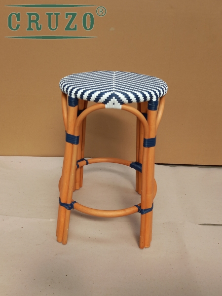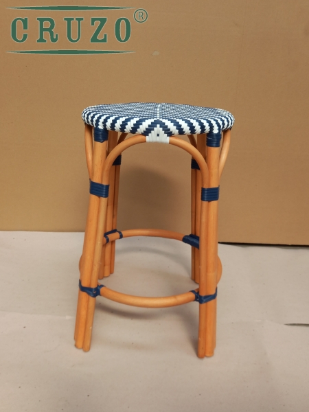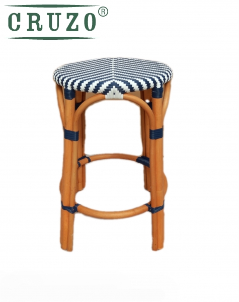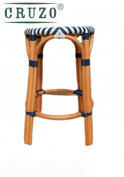 Барний табурет ручної работи в стилі "френч бістро".Паттерн плетіння зроблений в формі армійського шеврону.Каркас повністю з натурального ротангу ,а сидіння -зі штучного . Кольра : синій и білий .Колір каркасу з натурального ротангу - темно-медовий.