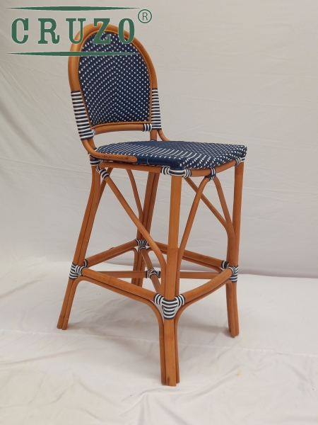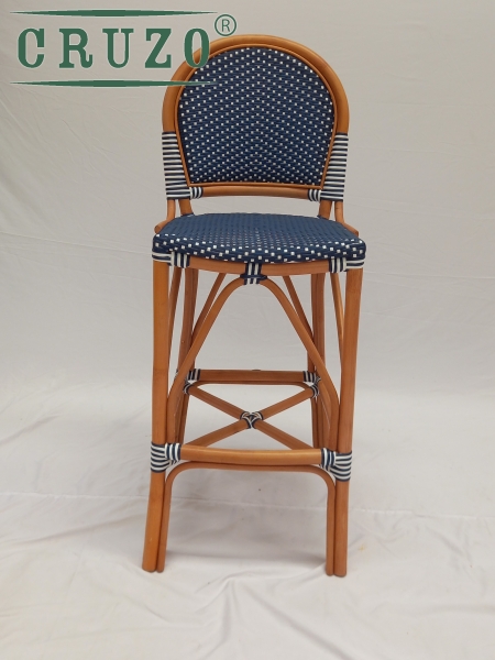 Каркас стула зроблений з натурального ротангу пофарбований в темно-медовий колір.Сидіння та спинка барного стулу в ручну оплетене з синтетичного ротанга в 2 -х кольорах (білого та синього). З'єднання виконані синтетичним ротангом .Вагу витримує не менше за 130 кг.Для зручності для ніг є підтримка.Зроблено надійно для задоволення під наглядом спеціалістів для ТМ CRUZO